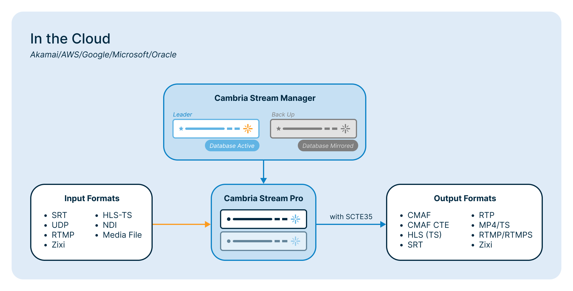Cambria Stream Pro is a flexible, scalable live encoder designed for fully automated, cloud-based streaming workflows. It ingests a wide range of live inputs and encodes and packages them for delivery via HLS, MPEG-DASH, CMAF, SRT, and Zixi.